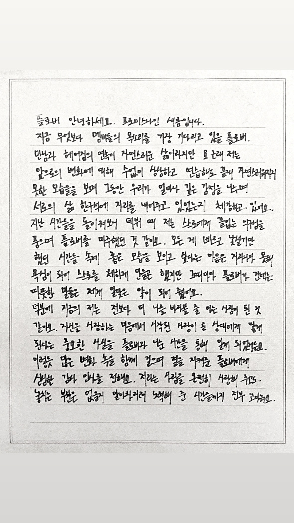 저 새롬과 하영, 지원, 지선, 서연, 채영, 나경, 지헌을 그리고 프로미스나인을 아끼고 사랑해 준 플로버 분들 감사합니다. 우리는 언제나처럼 서로의 안녕을 물으며 지내자구요. 다시 한번 고맙고 사랑해요. !! ♥